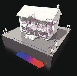Les tuyaux d'eau réchaffée passe alors dans une pompe à chaleur où la chaleur est récupérée pour chauffer les bâtiments. En général, un ou deux forages sont nécessaires pour le chauffage d’une maison. Pour le chauffage de gros bâtiments, il peut être nécessaire de mettre en place un « champ » de plusieurs dizaines de sondes.