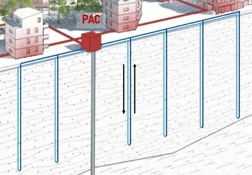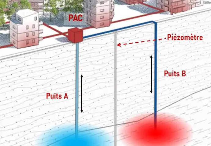 L’eau refroidie après son passage dans la PAC est renvoyée dans le sous-sol via un deuxième puits (puits de réinjection). En général, deux puits (un de captage et un de réinjection) peuvent suffire à chauffer des dizaines d’habitations.